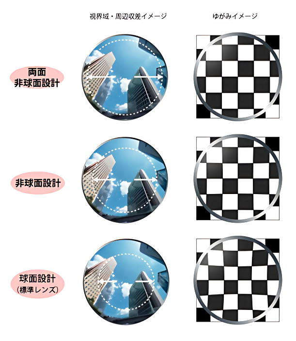 非球面設計のレンズは、 球面レンズと比較すると薄く軽量であり、レンズ周辺部の歪みを軽減し、より自然な見え方を提供します。