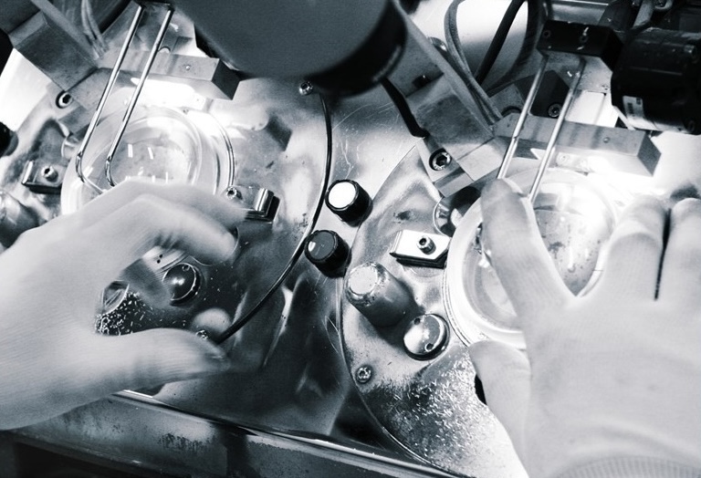 クリングスをヤットコを用いてメガネパットと鼻の位置を正しく合わせ、耳のかたちに沿ってテンプル調整します。