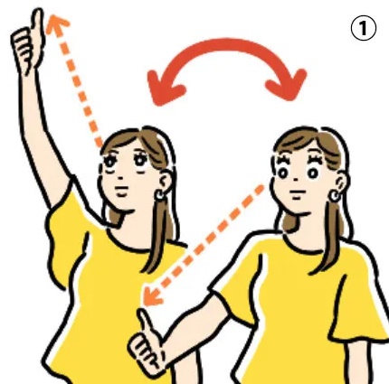 ① ひじをのばして親指を見ながら、手を上下に動かす。このとき、顔や眉は動かさず、目だけで親指を追うようすること。5~10往復が目安。
