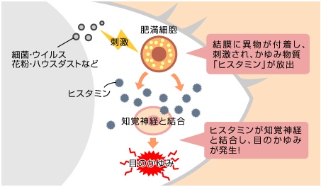 目のかゆみは、細菌やウイルス、花粉、ハウスダストなどの異物が目に入ってきた時に起こる、目の症状です。異物が目の白目の部分に付着すると、目の粘膜にある肥満細胞から「ヒスタミン」という「かゆみのもと」となる物質が放出され、知覚神経を刺激します。その「メカニズム」によって、目のかゆみを起こしたり、涙の量を増やしたりするのです。